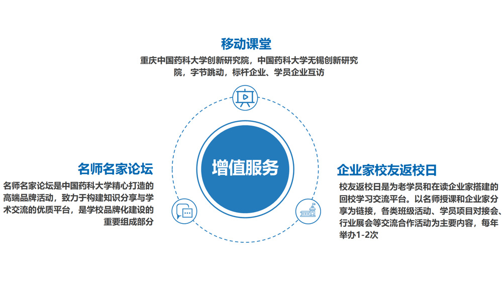 经典课程面授、沙龙论坛、标杆企业参访、研发探秘、小组研讨、班级团建、资本对话、学员企业互访等。