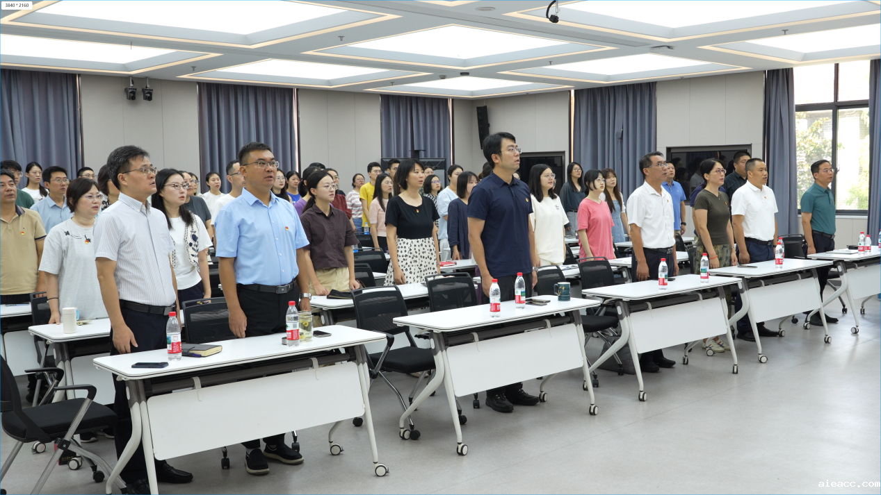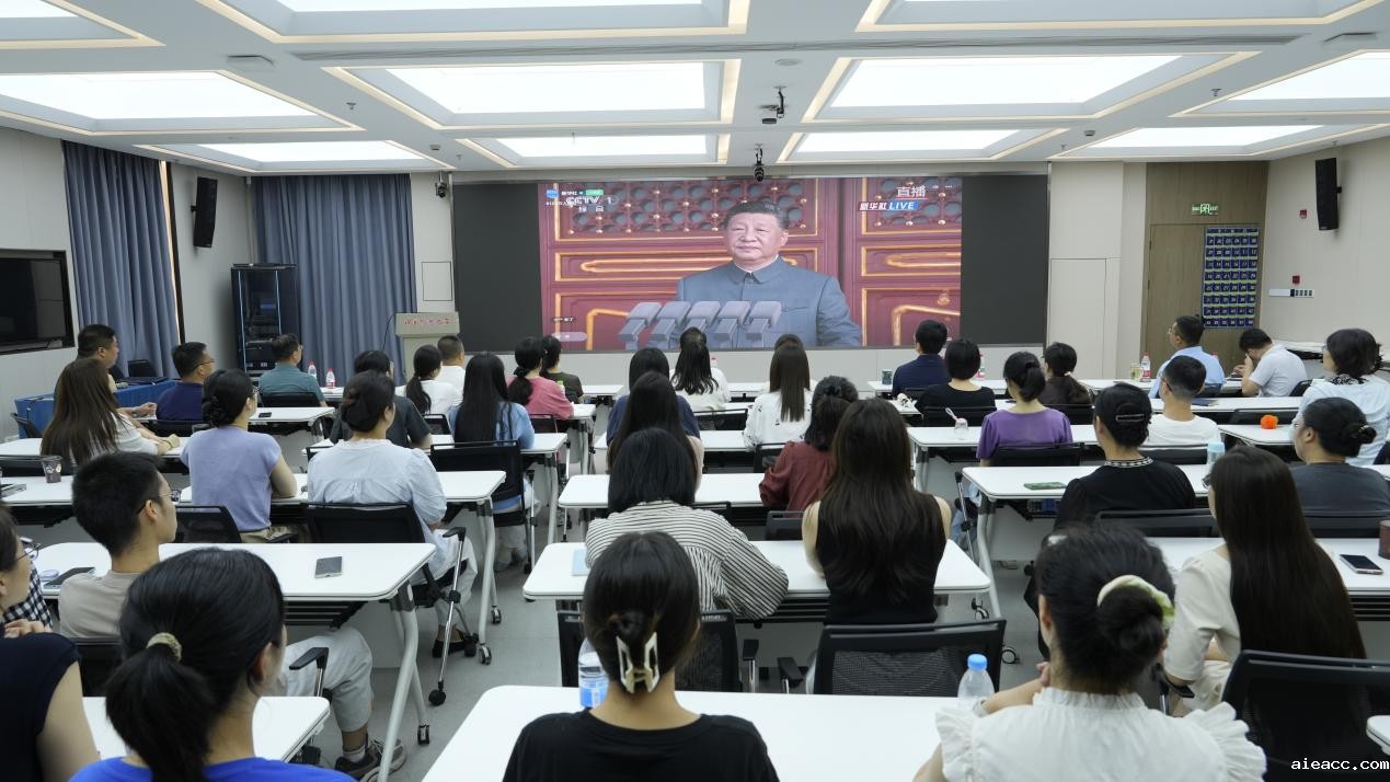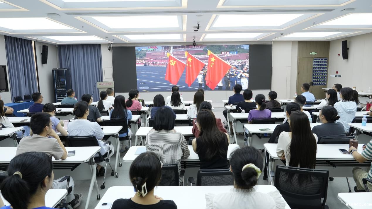 活动开始前,党员们早早来到报告厅,整齐就座,精神饱满,胸前的党徽熠熠生辉,现场气氛庄重而热烈。9时整,纪念活动正式开始。随着激昂的国歌声响起,全体党员起立,面向屏幕共唱国歌,向国旗行注目礼。习近平总书记的重要讲话发出了“铭记历史、缅怀先烈、珍爱和平、开创未来”的伟大号召,让在场的党员们心潮澎湃、激动万分。随后的阅兵式环节,党员们全神贯注,认真投入;当受阅部队迈着整齐有力的步伐通过天安门广场时,磅礴的气势、坚定的力量和飒爽的英姿让党员们无比震撼;而多种新型武器装备和信息技术方队的亮相更是让人感受到了无比的自豪和荣光。